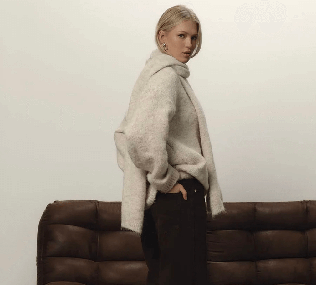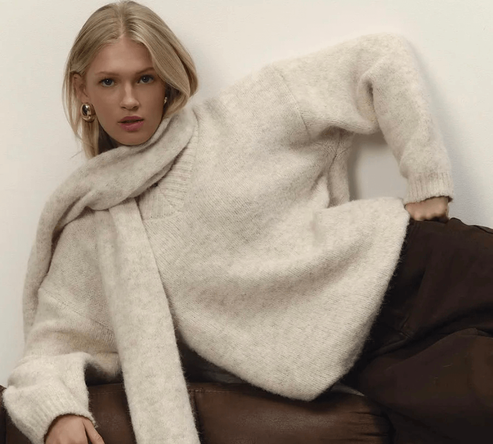 Der Pullover schmiegt sich sanft an die Haut, während der voluminöse Schal wohltuende Wärme spendet und Dir unterwegs das Gefühl gibt, ein Stück Zuhause bei dir zu tragen. Gemeinsam sind sie einfach unwiderstehlich: so bequem und gleichzeitig unglaublich trendy.
