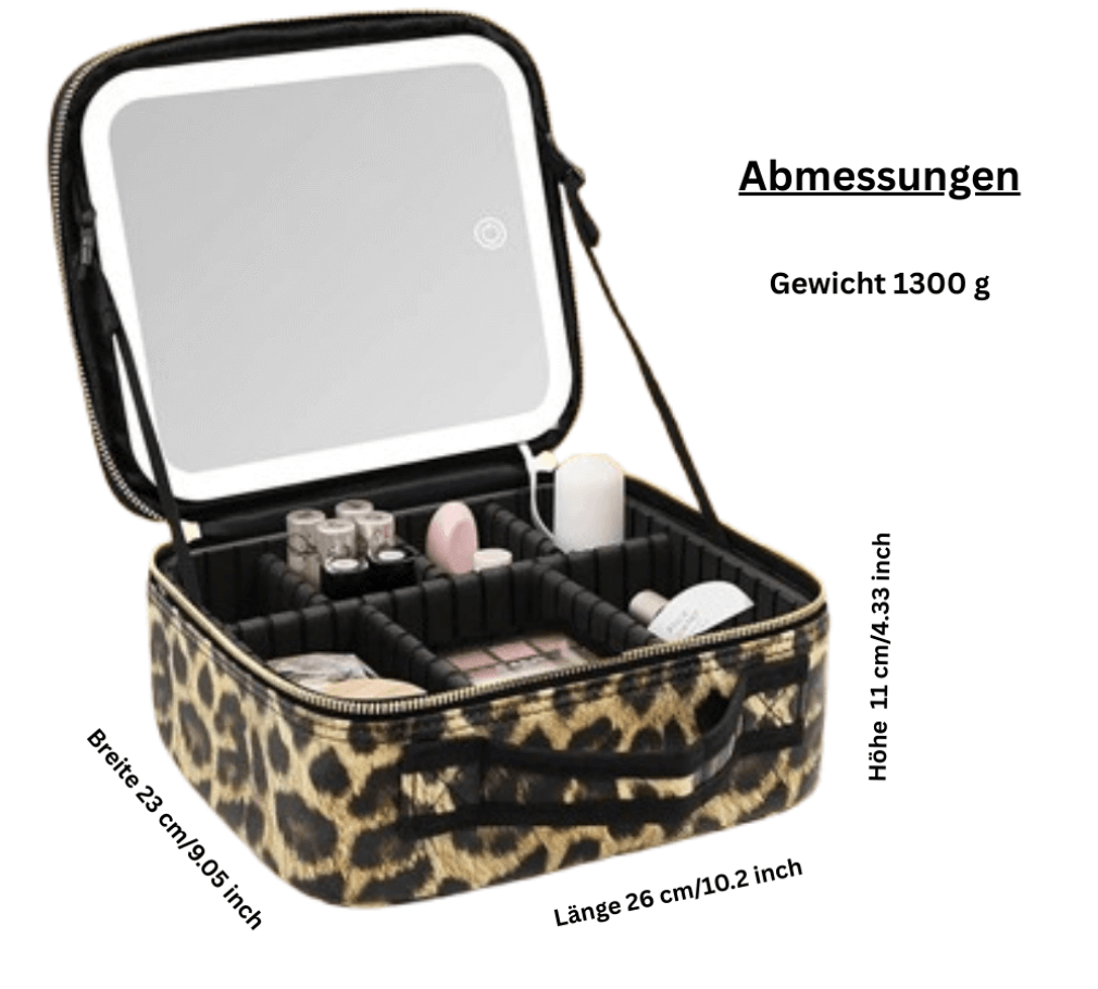 Der Make-up Koffer im Leoparden-Design mit einem LED-beleuchteten Spiegel